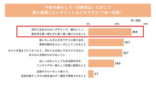 さらに、相次ぐ物価高騰を受け、消費者の購買意識にも明確な変化が表れています。 調査では、「初期費用が高くても長く使えるものを選びたい」「機能性も耐久性も重視したい」と回答した人が合計で73.0%に達しました(図10参照)。また、今後「収納用品」に対して最も重視したいポイントを尋ねたところ、「流行に左右されないデザインで、壊れにくく、数年先も買い替えずに長く使い続けられること」が30.0%で最多となりました(図11参照)。この結果から、目先の安さだけを優先するのではなく、一度手にしたものを大切に使い続ける「長期的なコストパフォーマンス」を重視する傾向が強まっていることが分かりました。