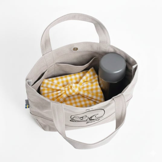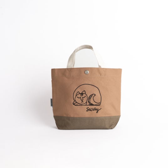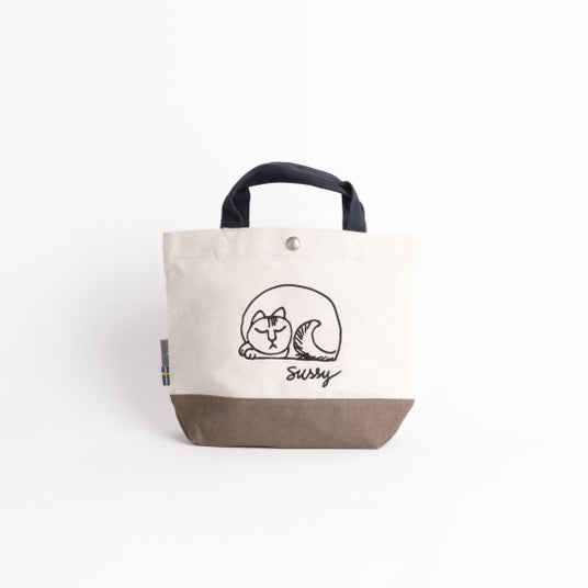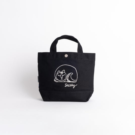 ■すやすや眠るスッシーが寄り添う、毎日使えるミニトートバッグ中央に大きく刺繍された「スッシー」が、シンプルな装いのアクセントに。