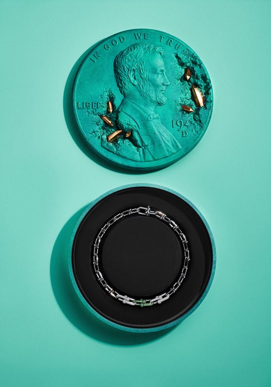 ハードウェア コレクションは、その誕生の地であるニューヨークのように不朽のエネルギーと自由な精神を体現しています。さらに、1974年にティファニーが初めて紹介したレガシー ストーンであるツァボライトの鮮やかなグリーンの色合いは、アーシャム スタジオのシグネチャー カラーであり、ブロンズ彫刻に施された美しい古色へのオマージュでもあります。