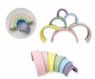 カラフルな虹のデザインのアーチを積み重ねてバランス感覚を養うスタッキングトイ。