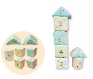 布製でやわらかくて赤ちゃんにやさしい、はじめてのつみき遊びにぴったりのセット。