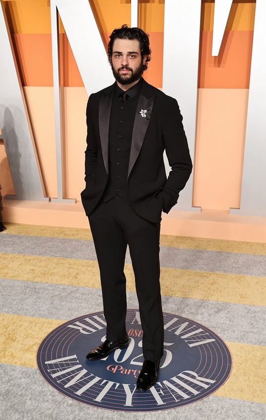 ノア・センティネオ(Noah Centineo)は、ジョルジオ アルマーニのブラックの1つボタンピークドラペルのタキシードにサテンの縁取りが施われたブラックのベスト、ホワイトのイブニングシャツ、タイを着用しました。