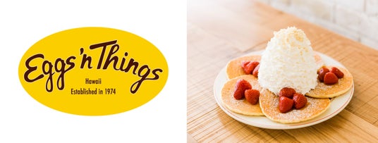 1974年ハワイで創業し、“All Day Breakfast”をコンセプトに、朝に限らず昼でも夜でもボリューム感のあるブレックファーストメニューを提供するレストラン。ゆったりとした時が流れる、居心地の良いハワイアンリビングのような店内では、Eggs ’n Things ならではのパンケーキやエッグベネディクトなどの定番朝食メニューはもちろん、ガーリックシュリンプやアヒポケなど本場ハワイの味わいを楽しめるロコフードも豊富にお楽しみいただけます。