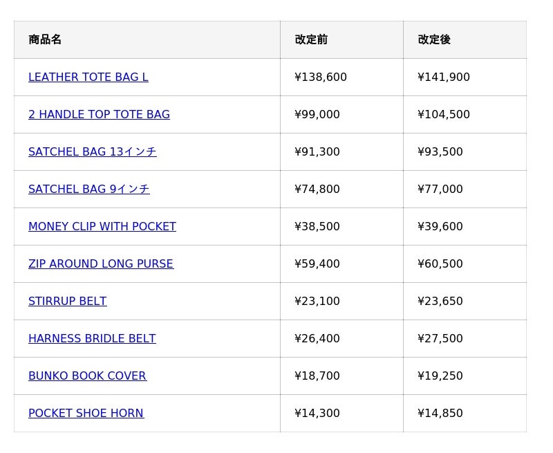 価格改定一覧(一部抜粋)