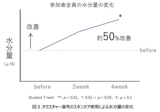 また、参加者のテクスチャー選好によるローションとクリームを1か月使用することで、水分量が有意に増加し、肌状態が改善することがわかりました。(図3)