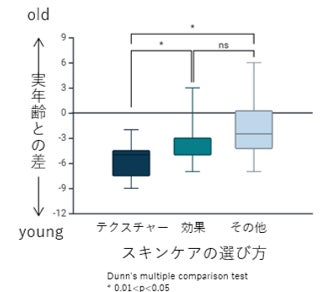 本研究では、20~50代の女性60名を対象に画像解析による肌年齢分析を実施し、スキンケア製品の選択基準別に肌状態を比較検証しました。その結果、テクスチャー(使い心地)を重視して製品を選んでいる群は、効果や成分などの他の要因を重視している群と比較して、実年齢と肌年齢の差が有意に若く、より良好な肌状態を維持していることが明らかになりました。(図1)