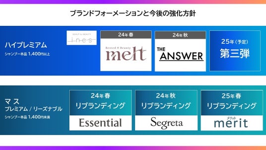 今回の事業変革では、拡大する「ハイプレミアム」市場*1への参入を本格化し、第一弾として「melt(メルト)」、第二弾として「THE ANSWER(ジアンサー)」を発売。併せて、「マス(プレミアムマス/リーズナブルマス)」市場*1における既存ブランド「merit(メリット)」「Essential」「Segreta(セグレタ)」をリブランディングし、ブランド力を高めていきます。これらの変革を通じて、花王は、ヘアケア事業を成長ドライバー事業へと育成強化してまいります。