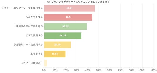 →1位は「デリケートエリア用のソープを使用する」、次いで「保湿ケアをする」「通気性の高い下着を選ぶ」が上位回答に。洗浄や保湿など、快適に保つためのアイテムを探して手に取る方が多いことがわかります。