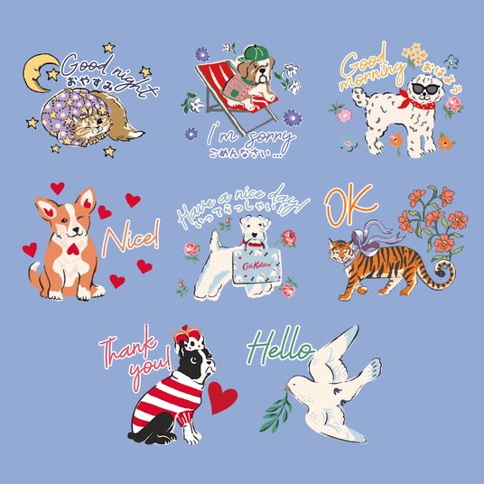 初めてのLINEスタンプには、ブランドの象徴的なキャラクターとして愛されている、キャス キッドソン氏の初代愛犬スタンリーといった、ブランドのテキスタイルでおなじみの犬や猫など可愛い動物たちが登場。「おはよう」「おやすみなさい」といった日常会話で頻繁にご利用いただける言葉を簡単な英単語にし、イギリスらしさ溢れるスタンプとなっております。