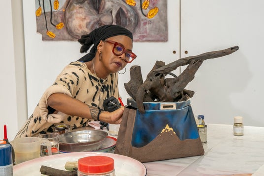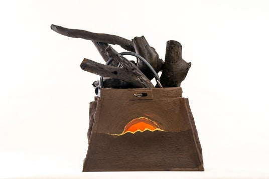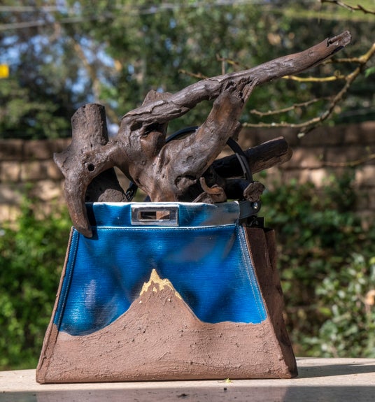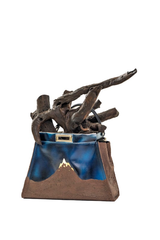 「フェンディの『ピーカブー(Peekaboo)』バッグは幾何学的で堅牢な佇まいを持っていますが、有機的で気まぐれな要素をすぐに加えたいと思いました。片面にはンゴングの丘(Ngong hills)を、もう一方の面には美しいケニア山(Mount Kenya)を描きました。この2つの山々がバッグを支えています。そして内側からは、美しい枝が押し出すように伸びていきます。これはもはやバッグではなく、一つの彫刻作品なのです」とワンゲキ・ムトゥは話します。