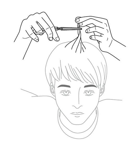 上(毛量の多い)の部分を真上に引き出してねじります。前髪と顔まわりの1~2cmはあまり切らないようにします。1回切ったら髪の毛を落とし、バランスを整えましょう。
