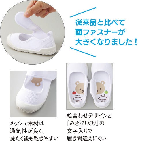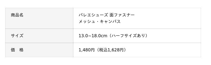面ファスナーが大きく開いて履きやすいバレエシューズ。