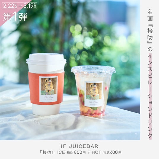 1 階『JUICE BAR』にて本イベント期間中、『CREATE BOTTLE』名画デザインのインスピレーションドリンクが登場いたします。【第一弾】の開催期間には、グスタフ・クリムトの名画「接吻」からインスピレーションしたドリンクを販売いたします。ICE はザクロの実とミントがドリンクを鮮やかに彩り、 果肉入りのふじりんごシロップとジンジャエールを合わせ、ミントの爽やかな 香りが広がるアップルジンジャーモヒートに仕上げました。また、ミントの爽やかさは残しながら、ほっと一息つけるアップルジンジャーの HOT もご用意しております。