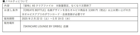『SKINCARE LOUNGE BY ORBIS』店舗限定でノベルティをご用意しております。『CREATE BOTTLE』名画デザインを含むオルビス商品を 3,500 円 (税込)以上お買い上げの方に先着順で名画「接吻」の A5 クリアファイルをプレゼントいたします。