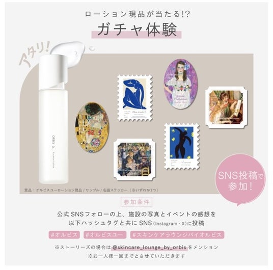本イベントの様子を SNS に投稿で、プレゼントが必ず当たるガチャガチャを体験いただけます。景品として『オルビスユー エッセンスローション』[現品]またはスキンケアサンプルセット、名画ステッカー全 6 種をご用意しております。