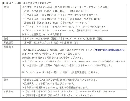 この度、2025 年 2 月 22 日(土)~5 月 19 日(月)の期間、『SKINCARE LOUNGE BY ORBIS』にて体験型アートイベント「TIMELESS BEAUTY~時代を超えて受け継がれる美しさ~」を開催します。『SKINCARE LOUNGE BY ORBIS』限定サービスとしてご好評いただいている『CREATE BOTTLE』に、全 3 回に分けて名画デザインが登場いたします。また、会期毎に名画と記念撮影できるフォトスポットやインスピレーションドリンクなどの体験型コンテンツも実施いたします。