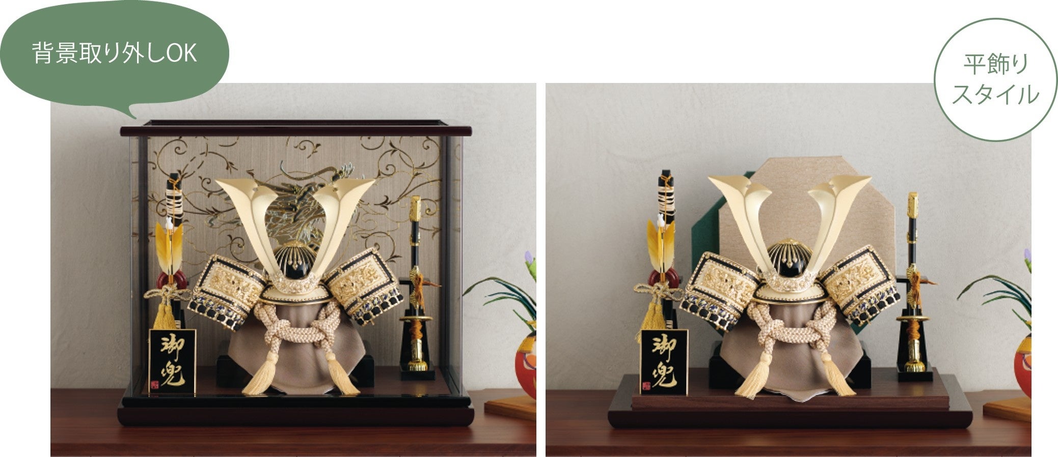 シャンパンゴールドの鍬形が特長的な上品な兜を使用しています。六角形の背板はマグネットで取り外し可能です。取り外すと唐草模様と龍の背景で雰囲気を変えて飾っていただけます。