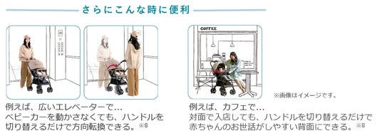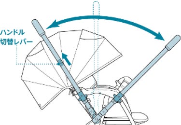 風や日差しを避けたい時など、赤ちゃんを乗せたままハンドル切替レバーの操作だけで、対面・背面が切り替えられる。