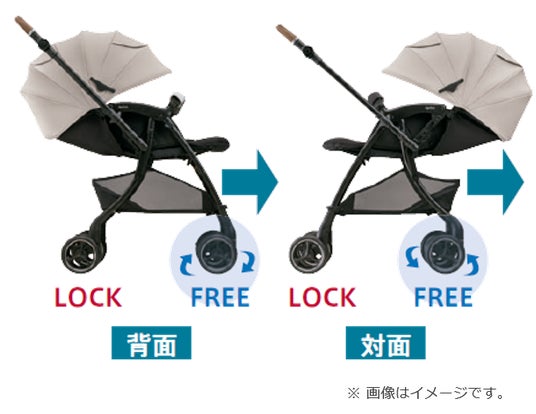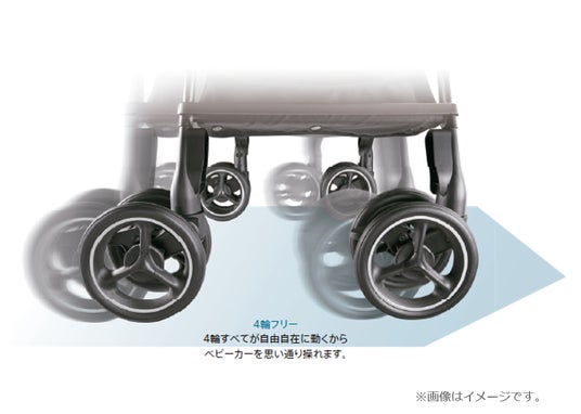 ハンドルレバーを握るだけで4輪全てが自由に動き、スッと真横にスライド移動ができる。人混みや狭い場所などでも自由自在に動けるので、ベビーカーでの外出も快適。