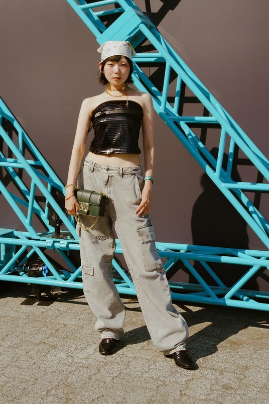 ニュートラルカラーのニットトップスやミニワンピース、A|XらしいシンプルなTシャツを合わせたスタイルや、煌めくビスチェにバギーパンツ、澄んだ色彩のグラフィカルなシャツをアクセントにしたハーフパンツスタイルなど、ブラックを主役にしながらも素材や質感で遊びを効かせ、ミュージックシーンと呼応する装いをそれぞれに表現しました。