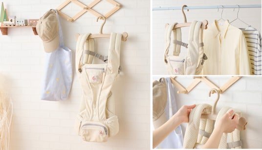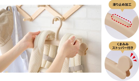 よだれや汗などの汚れが気になるから、頻繁に洗たくしたい抱っこひも。このハンガーなら干している間も型崩れしにくく、乾いたらいつもの置き場所へそのまま移動できます。
