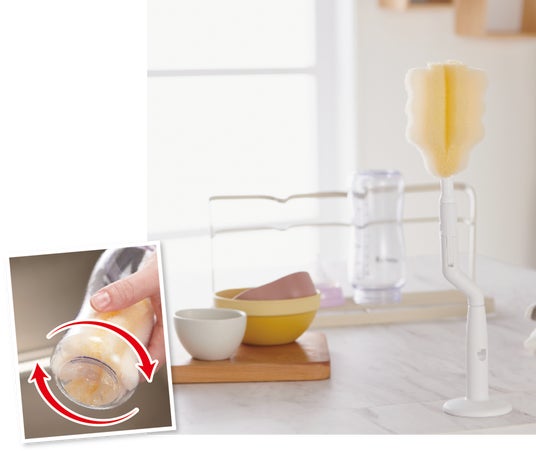 スポンジの大きさや形状は、広口ほ乳びんに合わせた設計なので、底や肩口などミルク汚れがたまりやすい場所にもフィットし、少ない力できれいに洗えます。