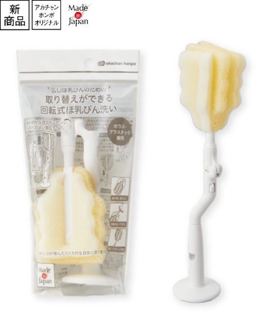 本商品は、サイズアップしたほ乳びんでもすみずみまでムラなく洗浄でき、届きにくい部分の汚れも効果的に落とすことができる、回転式のスポンジブラシです。