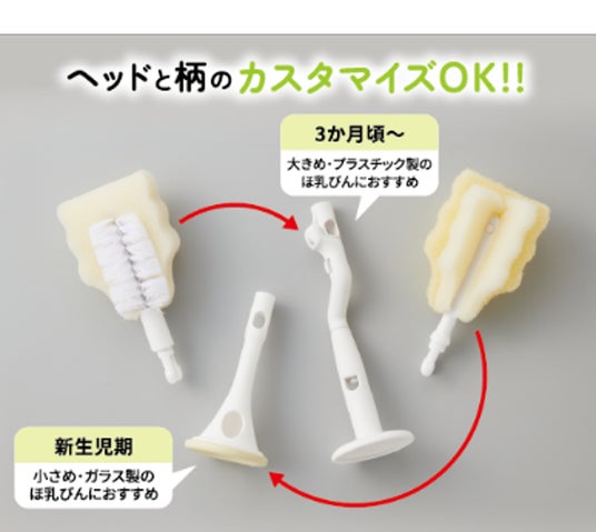 「\広口ほ乳びんのための/取り替えができる ほ乳びん洗い」のヘッドと互換性があり、柄だけ回転式にしたいときなど、シーンに合わせて使い分けできます。