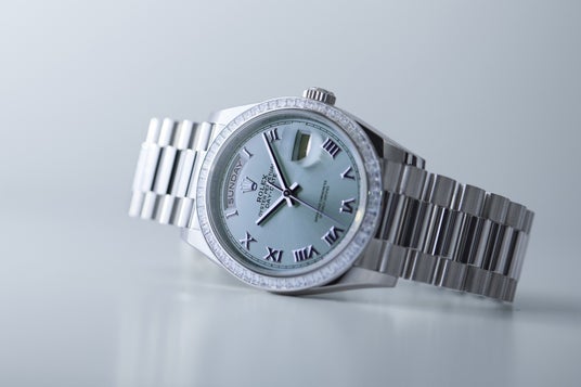ロレックスにおけるハイエンドコレクションのデイデイト。貴金属でのみ展開され、フルスペルの曜日表示は唯一となる。アイスブルーダイヤルはロレックスのプラチナ製モデルにおいて特別で、デイデイト・コスモグラフデイトナ・パーペチュアル1908・ランドドゥエラーでのみ展開。ベゼルにはバゲットカットダイヤが施され、ラグジュアリーかつクールな世界観を纏っている。半円形の3列リンクプレジデントブレスレットが気品高い雰囲気をさらに引き立てている。