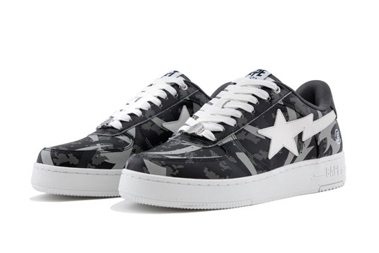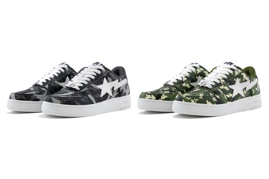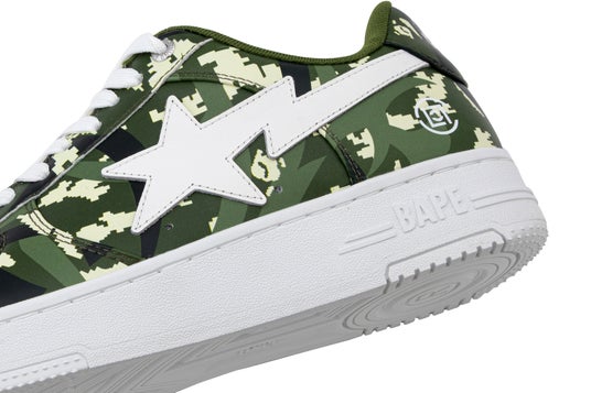 BAPE STA(TM) はアッパー全体にコラボレーションカモフラージュパターンを施したデザインとなっています。 ホワイトのSTAロゴがアクセントとなり、洗練された印象に。 シューレースタグには、左足にBAPE(R)のエイプヘッド、右足にCLOTのロゴが配されており、両ブランドの継続的なパートナーシップを象徴した一足にしあがっています。