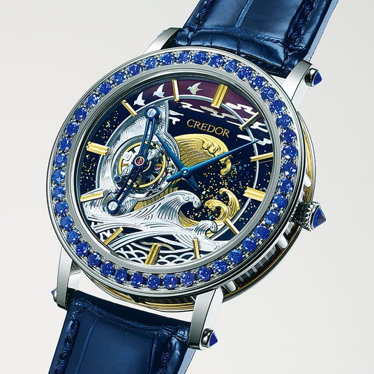 代表作の「叡智II」は、世代を超えて受け継ぐことのできる”究極のシンプリシティ”をコンセプトに、極限まで研ぎ澄まされたモデルです。ガラス質の艶やかさと透明感をもつ磁器ダイヤルに、卓越した職人が12箇所のアワーマークとCREDORロゴを一点一点手描きしています。
