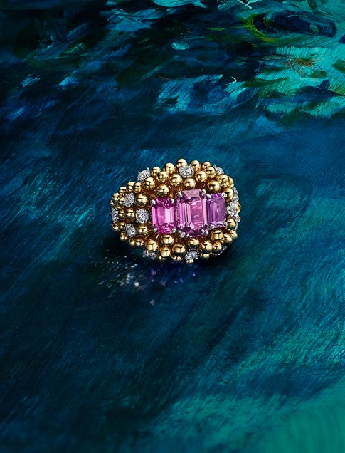 「ブルーム」では、花が咲き誇る直前の瞬間を捉え、柔らかなピンクやパープルのサファイヤにダイヤモンドを添えて表現しています。本コレクションの中でも際立つ存在として、すべての作品が18Kイエローゴールドのみで仕立てられ、プラチナ、またはプラチナとゴールドを組み合わせた他の作品とは異なる魅力を際立たせています。