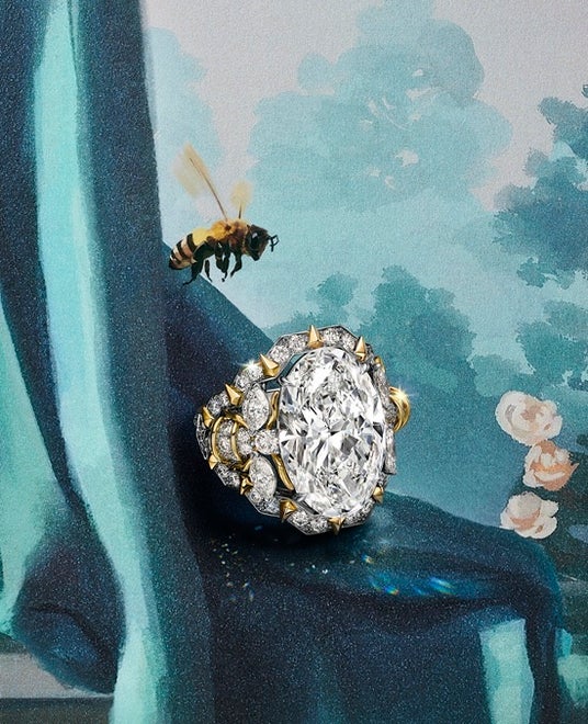 「ビー」は、シュランバージェのアイコニックな「ツー ビーズ」リングに着想を得て、ハニカム構造を思わせる格子状のデザインと有機的な動きが織りなす、洗練された造形を探求しています。オーバルカット ダイヤモンドは、18Kイエローゴールドで彩られた幾何学的な六角形の中に配され、中心には10カラットを超えるDカラー、インターナリー フローレスのオーバル ダイヤモンドを据えたリングが登場します。そこには、ひそやかに配されたミツバチのモチーフが繊細に縁取られています。