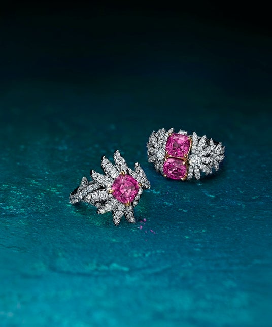 「パーム」は、しなやかにねじれる葉の造形の中に、モザンビーク産の非加熱オーバルカット ルビーをあしらい、コレクションを締めくくります。鮮やかな色彩と輝きを備えたこれらのルビーは、精緻に選び抜かれたジェムストーンを扱うティファニーの伝統を体現しています。また、もうひとつのセットでは、ダイヤモンドが滝のように流れ落ちるかのように配され、陽光を受けた葉の動きと輝きを捉えています。
