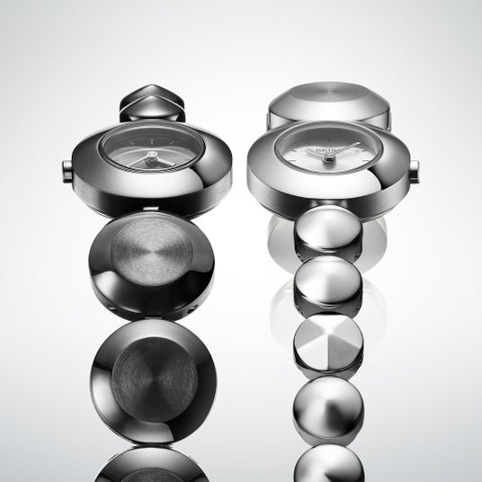 時計本体と12時側の大きな丸いこまを同じような大きさと形状に設計し、一体感を表現することで、ファッションアイテムのような軽やかさを実現。また、サイズの異なるこまを12時側と6時側で使い分けたアシンメトリーなブレスレットは、様々な価値観を内包する今の時代にふさわしい新しいスタイルを目指しました。着用した人の最も目に入りやすい、6時側から3つ目のこまだけに施された、きらりと輝く多面カットは、着ける人たちの心が高揚するような、ブレスレットらしい遊び心のあるワンポイントとしてあしらっています。