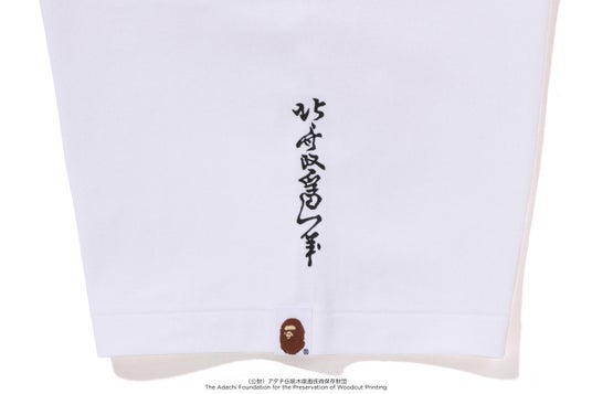 Tシャツは、北斎と国芳のアートをモチーフにした“APE HEAD”デザインの全4型。BAPE(R)︎ CAMOで彩った名作をAPE HEADのシルエットに落とし込み、カタカナで“ア ベイシング エイプ(R)︎”のタイポグラフィをレイアウトしました。左袖には、それぞれの絵に押された落款(作者の署名)をプリント。ホワイト、ブラック、ネイビーの3色展開です。