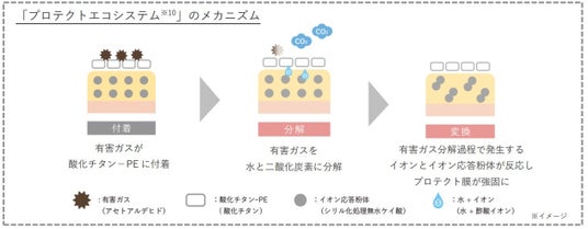 有害なガス※9さえも味方に変える成分「プロテクトエコシステム※10」を配合日中の肌が置かれる過酷な状況に着目し、有害なガス※9さえも味方に変える成分「プロテクトエコシステム※10」を配合。自動車の排気ガスやたばこの煙などに含まれる有害なガス※9を水と二酸化炭素に分解し、その過程で発生するイオンでプロテクト膜をより強固にする、画期的なテクノロジーを実現する成分を配合しました。
