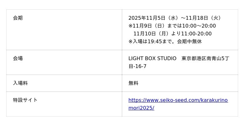 セイコーウオッチ株式会社(代表取締役会長 兼 CEO 兼 CCO:服部 真二、本社:東京都中央区)は、腕時計の新たな可能性を育み、腕時計の様々な楽しさを体験できる活動「Seiko Seed(セイコー シード)」の一環として、セイコーの機械式腕時計の特性とムーブメントに込められた技術の可能性を伝える展覧会「からくりの森」を2025年11月5日(水)から11月18日(火)までの期間、港区南青山にあるライトボックススタジオで開催します。
