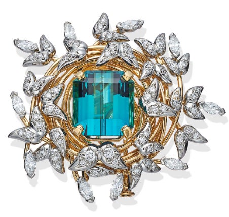 Jean Schlumberger by Tiffany Nest Brooch in Yellow Gold and Platinum with a Blue Tourmaline and Diamonds