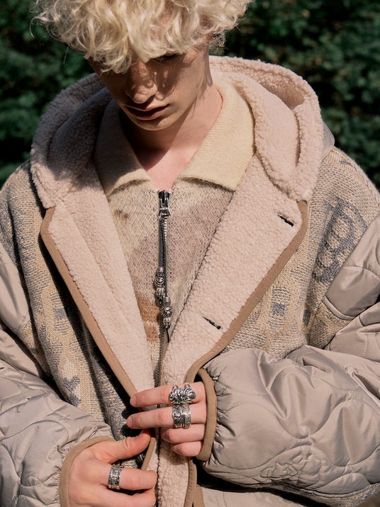 ツイードジャケット、フェイクファーコート、ファーカラー付きのシェルパデニムジャケットといったアイテムにも、MAD FACEのブローチやレザー&モーターのディテールが散りばめられ、反骨精神と洗練を併せ持つ美学を際立たせます。