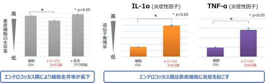この原因を探求するため、エンテロコッカス菌とともに表皮細胞を培養し、その生存率やどんな遺伝子に変化があるかを調査しました。その結果、エンテロコッカス菌によって表皮細胞の生存率の低下が確認されました(図2)。これは皮膚常在菌においてメジャーな存在である表皮ブドウ球菌のときは起こらない現象であり、エンテロコッカス菌によって引き起こされるものであると考えられます。また、この菌の産生する代謝物を含む培養上清や、死んだ菌でも検証したところ、細胞生存率は低下せず、これは生きたエンテロコッカス菌の働きにより表皮細胞が受ける影響であることが分かりました。