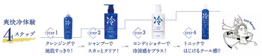 <左から:冷シャンプー、冷コンディショナー、冷スカルプクレンジング、冷トニック スカルプ&ボディ>