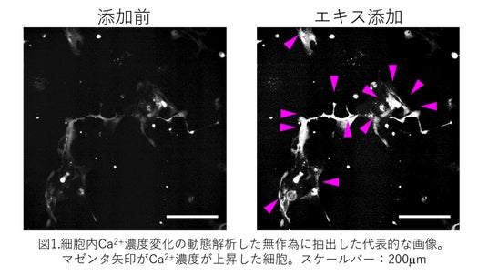 ゆずの残さから抽出したエキスを添加すると、大部分の細胞において細胞内Ca2+上昇(マゼンタ矢印)が観察された(図1)。ゆずの残さから抽出したエキスは、ヒトケラチノサイトに対して、細胞内Ca2+濃度上昇を引き起こすことから、Ca2+チャネルなどの活性化を促すことが示唆された。