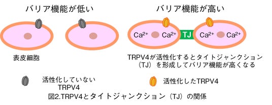 ヒトケラチノサイト(表皮細胞)において、TRPV4の活性がタイトジャンクションのバリア機能の制御に重要であり、TRPV4が活性化状態の時、皮膚バリア機能を担う表皮タイトジャンクションの形成を促進する働きを持つことがわかっています。