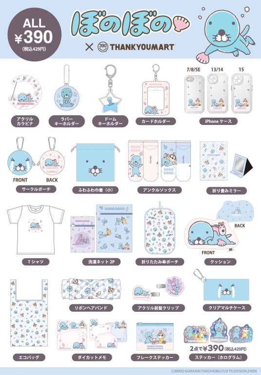 「Be Smile, Be Kawaii」をテーマに、キャラクターの限定アイテムを中心としたカワイイ推しグッズがいつ来てもALL390円で手に入るショップ「サンキューマート」は、いがらしみきお氏による漫画作品『ぼのぼの』とのコラボレーション雑貨を、全国のサンキューマート店舗で7月下旬より入荷次第販売開始いたします。