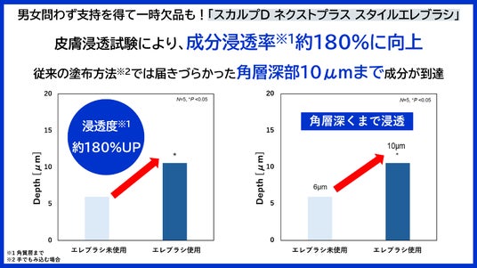 お客様からは「育毛剤を塗った後にエレブラシを使用した方が浸透している感じがする」などといった声を多数いただいており、実際の使用感として成分の浸透を実感されている方が多くいらっしゃいます。この度、その使用感について科学的に検証したところ、エレブラシ使用により成分の浸透率※1が約180%に向上、従来の塗布方法では約6μmだった角層への浸透深度を約10μmまで到達することが判明しました。多くのお客様が実感されていた浸透感が、数値としても証明される結果となりました。
