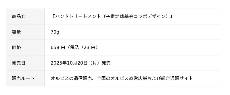 オルビス株式会社(本社:東京都品川区、代表取締役社長:山口裕絵、以下:オルビス)は、未来を担う子どもたちのすこやかな成長を応援するサステナブルな取り組みの1つとして、特定非営利活動法人 子供地球基金(所在地:東京都港区、代表:鳥居晴美、以下、子供地球基金)とコラボレーションした『ハンドトリートメント』オリジナル商品を、2025年10月20日(月)よりオルビスの通信販売、全国のオルビス直営店舗および総合通販サイトにて発売します。