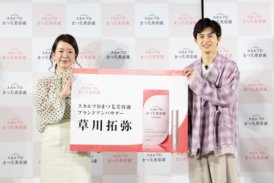 草川拓弥さんは、ピンク色のチェック柄のジャケットを身にまとい登場。衣装のポイントについて、「今回は、「スカルプDまつ毛美容液」のテーマカラーのピンクを取り入れてみました。WEBCMでも着用した衣装です!」と語りました。また、アンバサダーの意気込みを聞かれると、「自分自身、目元やまつ毛が印象的だとファンの皆さんから言っていただくこともあるのですが、まつ毛美容液のアンバサダーに、まさか自分がなれると思っていなかったので率直にすごく嬉しいです。」とコメント。