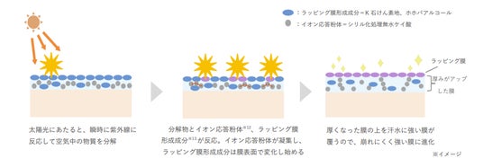 ※7 紫外線に瞬時に反応して、膜が厚くなり始めることおよび表面に新たな膜ができ始めることで、膜が強く崩れにくくなり、密閉することで保湿成分を浸透促進すること(角層まで)