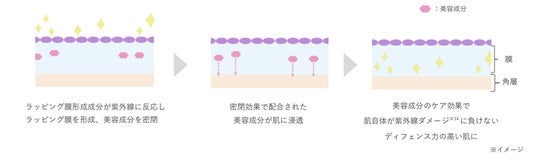 紫外線をスイッチに、肌の上の膜が自動で進化し始める技術を搭載。膜が厚みを増すと同時に、こすれ・汗・水に強く崩れにくく、美容成分の浸透促進までできるラッピング膜で、ディフェンス力アップを叶えます。【こすれ・汗・水に強く崩れにくい膜を形成】